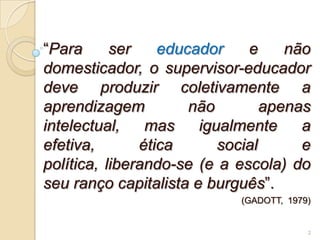 O documento discute a função do educador de apoio no Brasil desde 1988. Ele descreve a capacitação inicial e seleção dos educadores de apoio, bem como suas atribuições, como participar do projeto político pedagógico da escola, coordenar ações pedagógicas, e subsidiar professores e famílias. O texto também discute como o plano de trabalho do educador de apoio deve estar relacionado à prática pedagógica na escola.