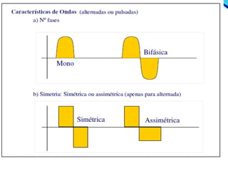 O documento apresenta os conceitos básicos da eletroterapia, incluindo definições de termos como corrente elétrica, campo elétrico e magnético. Detalha os diferentes tipos de correntes elétricas utilizadas e seus parâmetros, efeitos fisiológicos, equipamentos, eletrodos e contraindicações gerais.