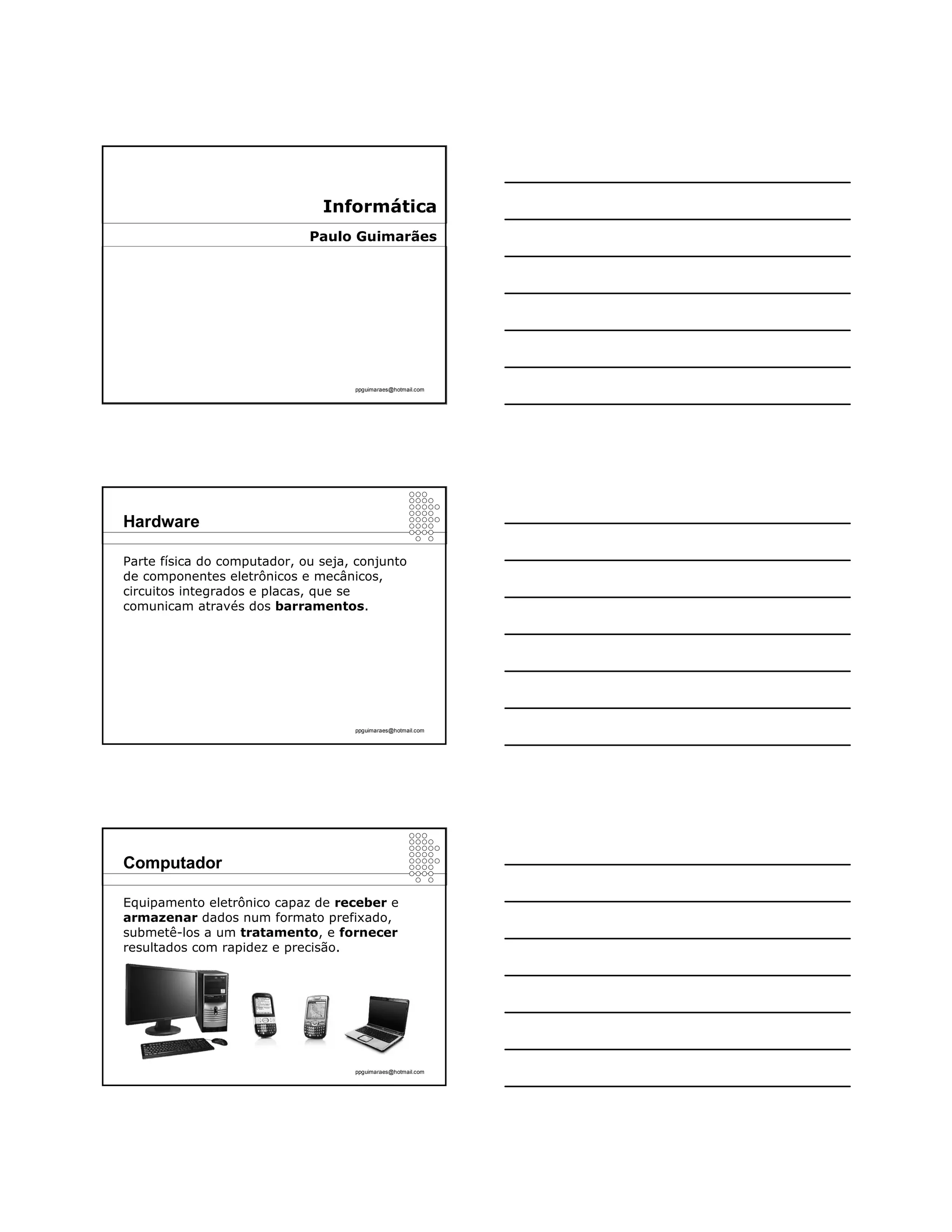 O documento discute os principais componentes de hardware e software de computadores. Detalha os componentes internos de um computador como a CPU, memória e barramentos. Também descreve periféricos de entrada e saída como teclado, mouse, impressora e monitor. Por fim, explica conceitos como arquivos, diretórios, mídias de armazenamento e tipos de softwares.