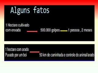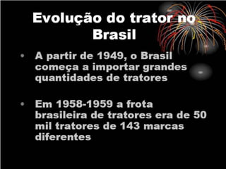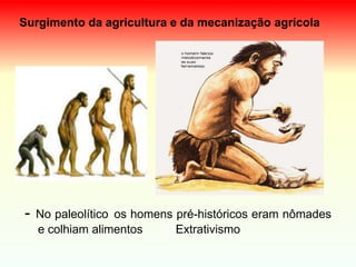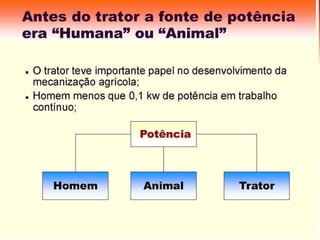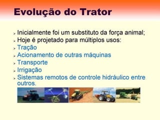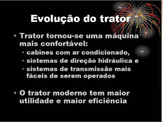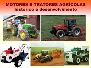 O documento descreve a evolução da agricultura e da mecanização agrícola ao longo da história, desde os primeiros homens pré-históricos até a atualidade, com o desenvolvimento de tratores cada vez mais potentes.