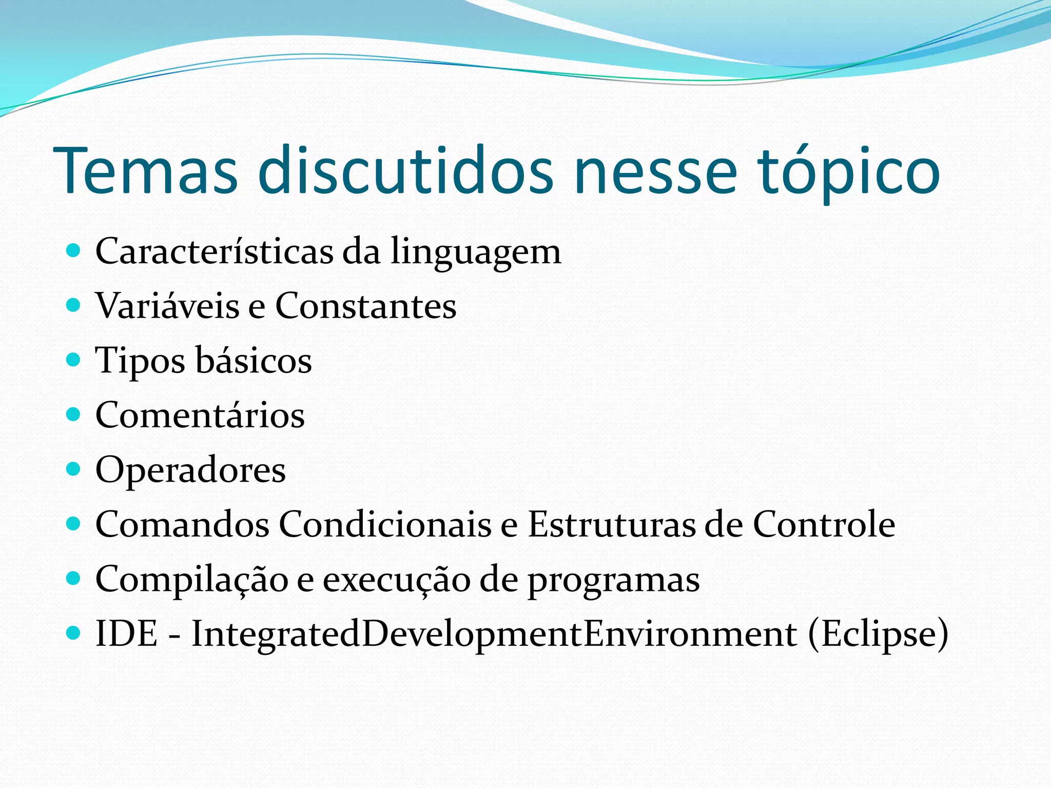 Temas discutidos nessetópicoCaracterísticas da linguagem Variáveis e ConstantesTipos básicosComentáriosOperadoresComandos Condicionais e Estruturas de ControleCompilação e execução de programasIDE - IntegratedDevelopmentEnvironment (Eclipse)