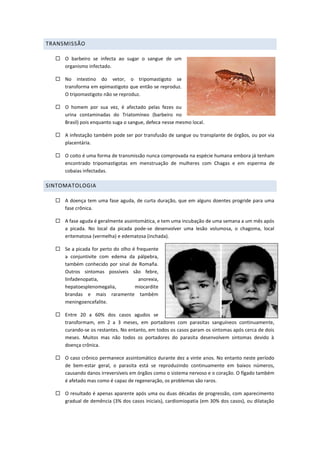 A doença de Chagas é causada pela infecção pelo protozoário Trypanosoma cruzi, transmitido pela picada de insetos conhecidos como barbeiros. Os sintomas variam entre uma fase aguda inicial assintomática e uma fase crônica que pode causar danos cardíacos e intestinais fatais. A doença afeta milhões na América Latina e sua prevenção foca no controle dos vetores barbeiros.