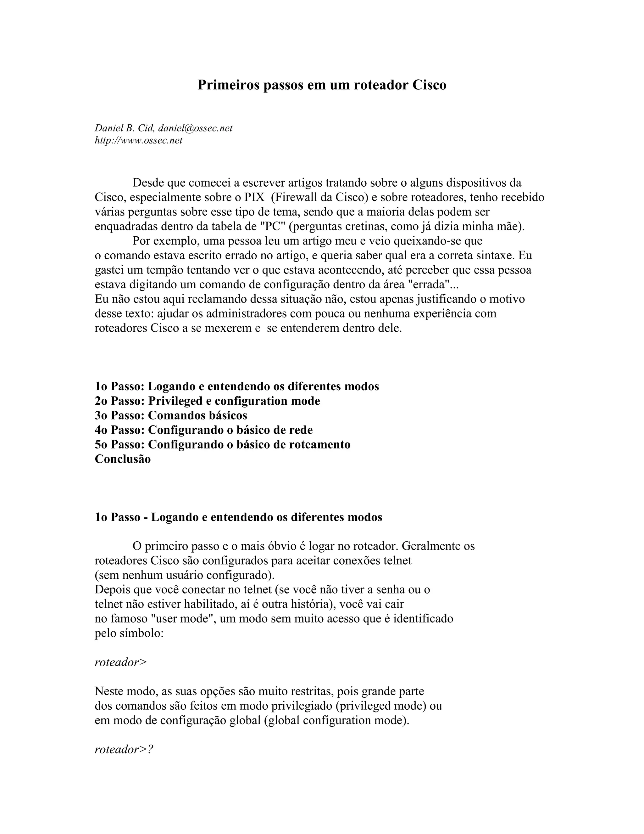Este documento fornece um guia passo-a-passo para configuração básica de um roteador Cisco, cobrindo tópicos como: 1) Logando e entendendo os modos de usuário, privilegiado e de configuração; 2) Comandos básicos como mostrar versão e configurações de rede; 3) Configurando rede e roteamento estático/RIP. O objetivo é ajudar administradores iniciantes a navegarem nos roteadores Cisco.