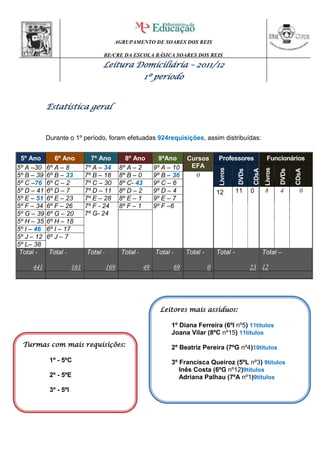 1) Foram realizadas 924 requisições de livros no primeiro período letivo, principalmente por alunos dos 5o anos.