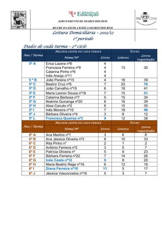 3) Os melhores leitores de cada turma variaram entre 2 a 11 livros lidos, com Diana Ferreira e Joana Vilar liderando a lista geral com 11 títulos cada.