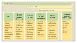 O documento descreve a evolução da Política Agrícola Comum (PAC) da União Europeia desde a sua criação em 1962 até as reformas de 2003. A PAC foi criada para aumentar a produção agrícola após a Segunda Guerra Mundial e garantir a segurança alimentar na Europa. Posteriormente, as reformas visaram ajustar a oferta e demanda, reduzir custos e proteger o meio ambiente.