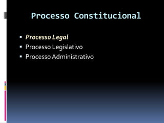 O documento discute os principais conceitos e tipos de processo constitucional, incluindo processo legal, legislativo, administrativo e judicial. Também aborda os principais princípios constitucionais do processo como o devido processo legal, contraditório e ampla defesa, motivação das decisões e juiz natural.