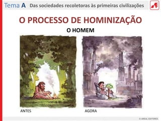 O documento descreve o processo de hominização, desde os primeiros hominídeos na África há 4 milhões de anos até o Homo sapiens sapiens. Apresenta as principais etapas da evolução física e intelectual do homem, como a fabricação de ferramentas de pedra e o domínio do fogo. Também menciona propostas de trabalhos relacionadas ao tema para turmas do 7o ano.