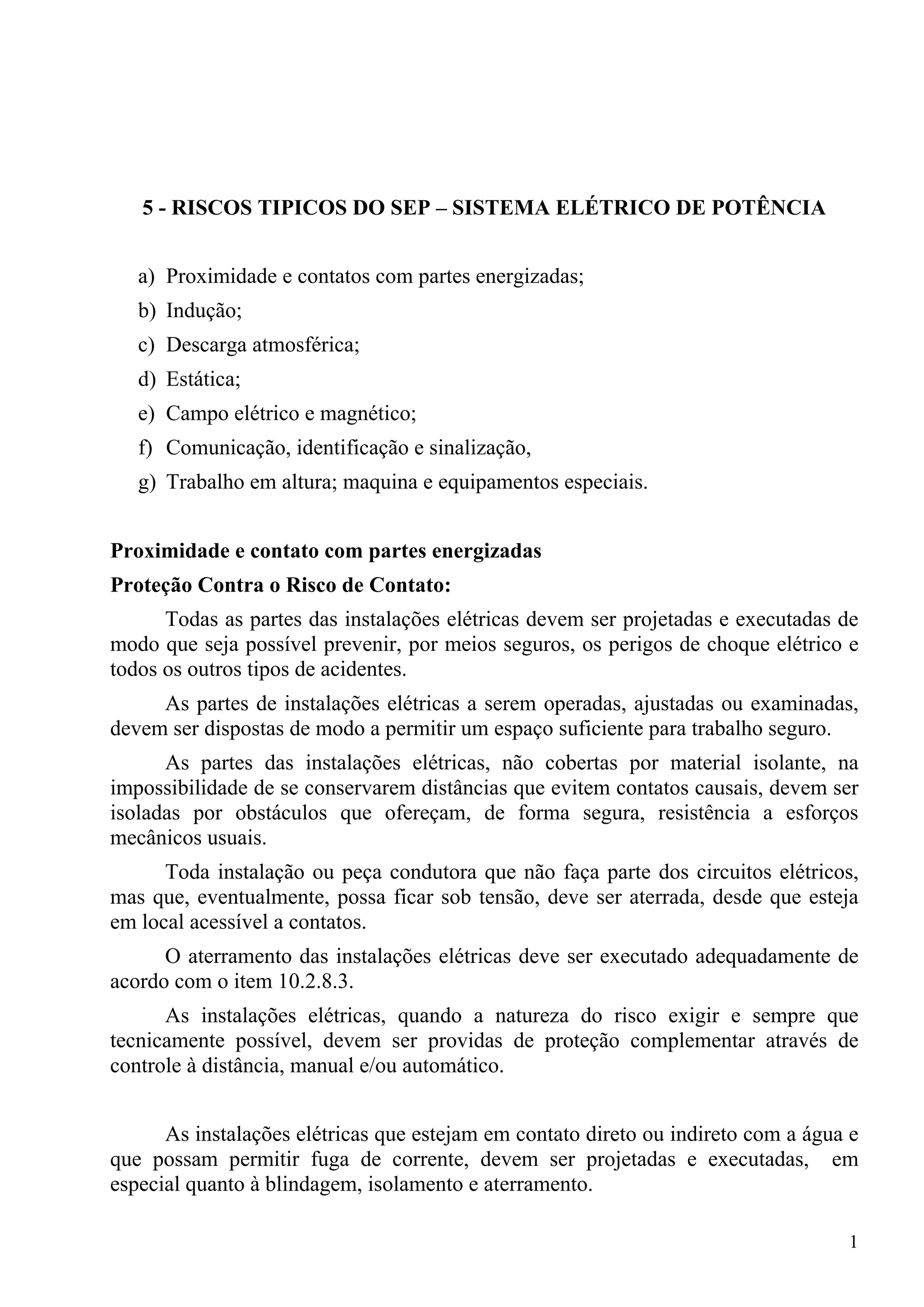1) O documento descreve os principais riscos associados a sistemas elétricos de potência, incluindo contato com partes energizadas, indução, descargas atmosféricas, estatismo, campos elétricos e magnéticos.