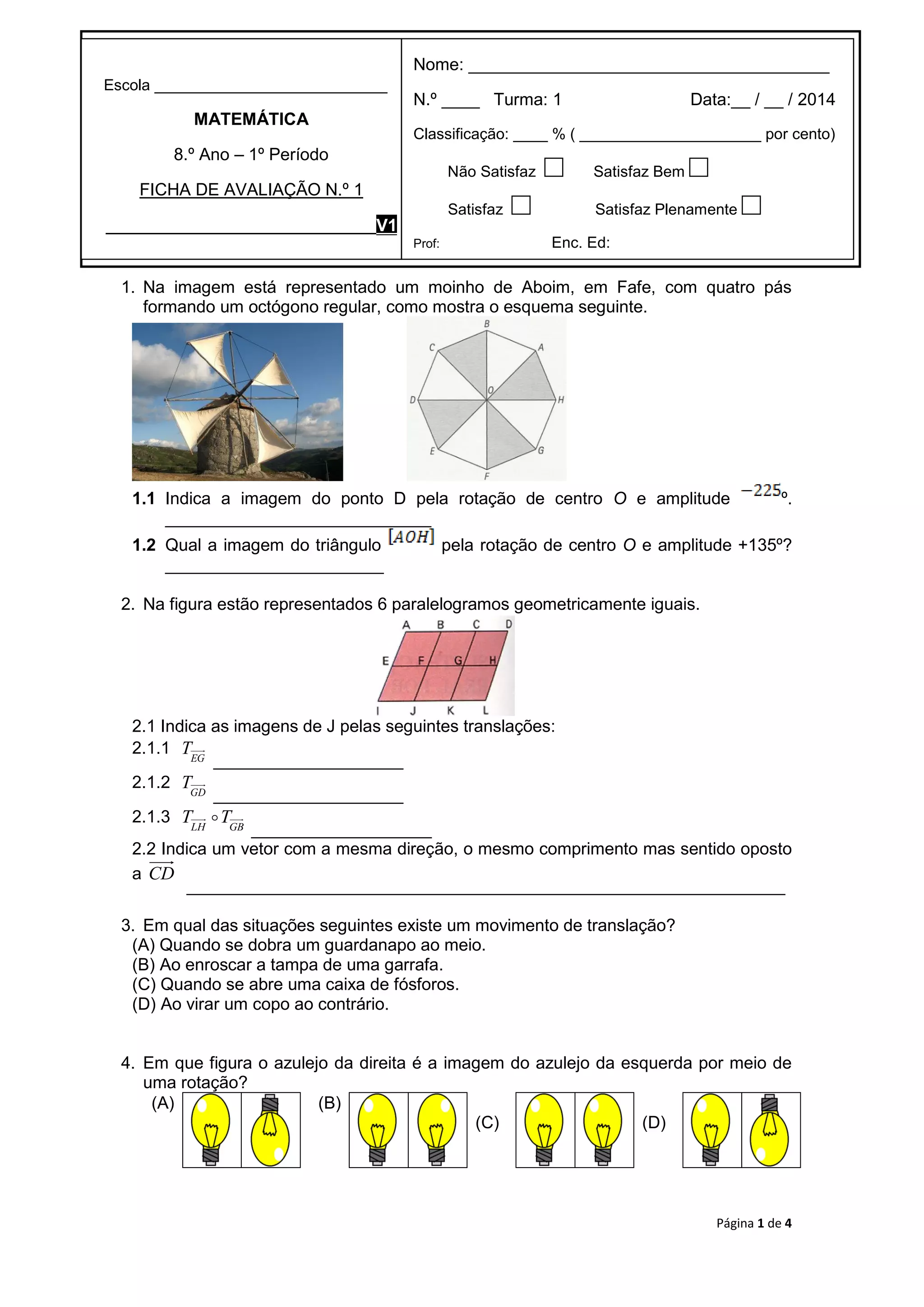 Este documento contém 13 questões sobre transformações geométricas como rotações, translações e reflexões. As questões abordam conceitos como determinar imagens sob diferentes transformações, identificar tipos de movimentos, calcular ângulos de rotação e coordenadas de pontos transformados. Há também uma questão sobre áreas de terrenos e plantação de árvores.