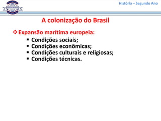 O documento descreve a colonização do Brasil pelos portugueses, incluindo as condições que permitiram a expansão marítima européia, os primeiros contatos com o território, a divisão das capitanias hereditárias e o estabelecimento do sistema de produção de açúcar que se tornou fundamental para o desenvolvimento colonial com mão de obra escrava.