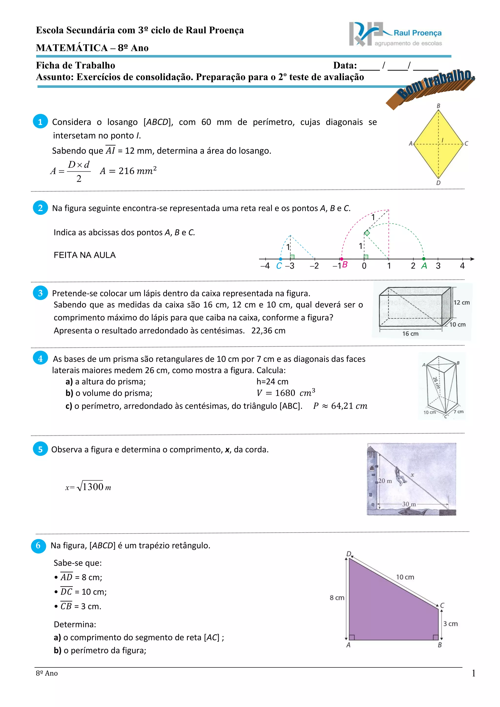O documento apresenta uma ficha de trabalho de Matemática do 8o ano com 25 exercícios sobre diversos tópicos como geometria plana e espacial, sistemas de equações, álgebra e lógica. Os exercícios envolvem cálculos, resolução de problemas, classificação de figuras geométricas e verificação de propriedades.