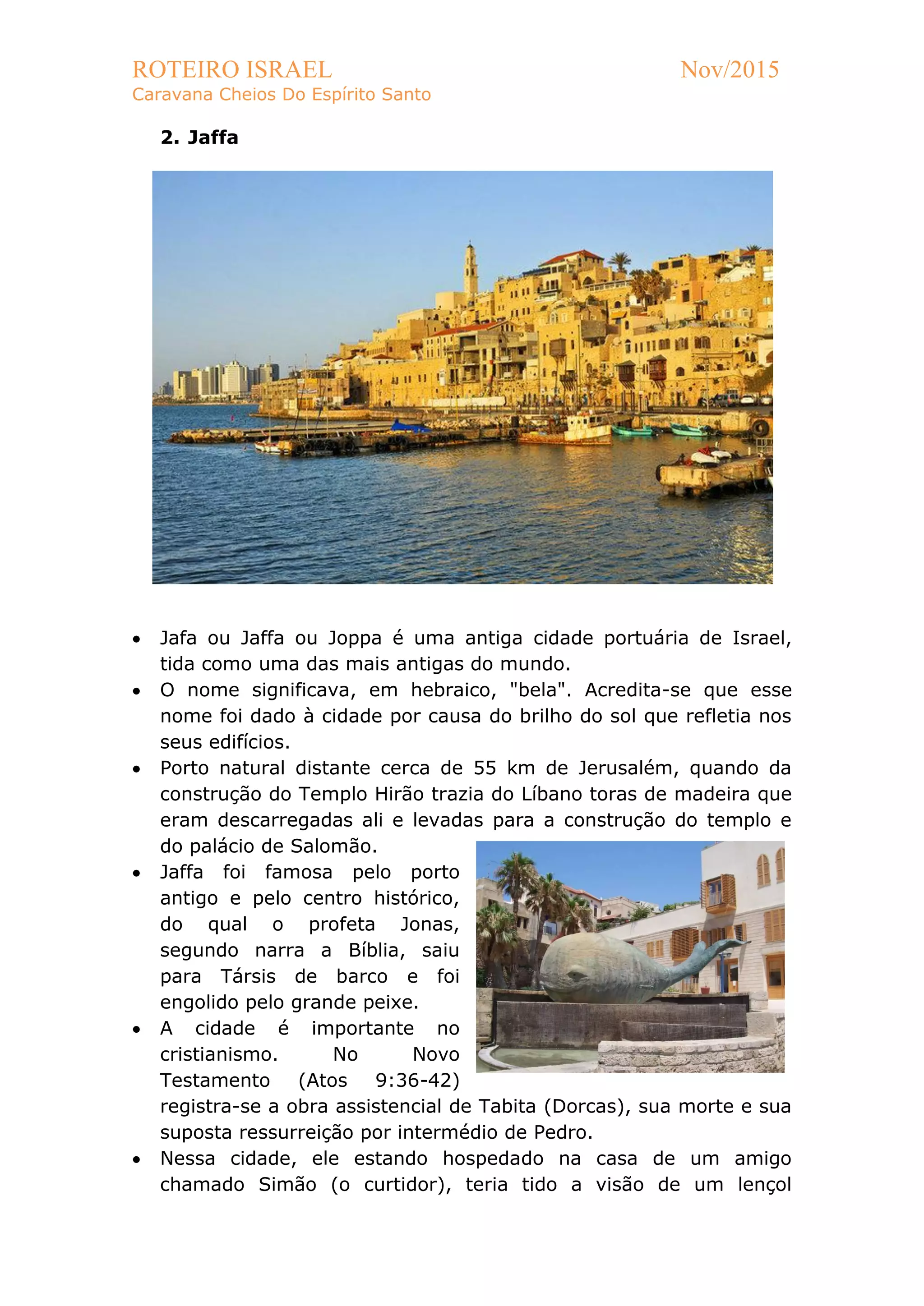 Jaffa é uma antiga cidade portuária de Israel, conhecida como uma das mais antigas do mundo. Foi famosa pelo seu porto antigo e centro histórico, de onde o profeta Jonas zarpou em direção a Társis segundo a Bíblia. A cidade também é importante no cristianismo, onde Pedro teria tido uma visão e recebido a visita de homens enviados por Cornélio.