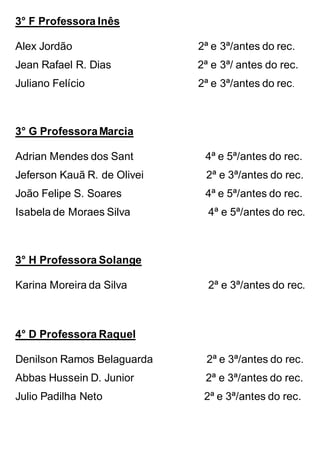 O documento lista os nomes de alunos e os dias da semana e horários em que eles têm aulas com diferentes professoras das 2a, 3a e 4a séries. As aulas ocorrem antes ou depois do recreio.