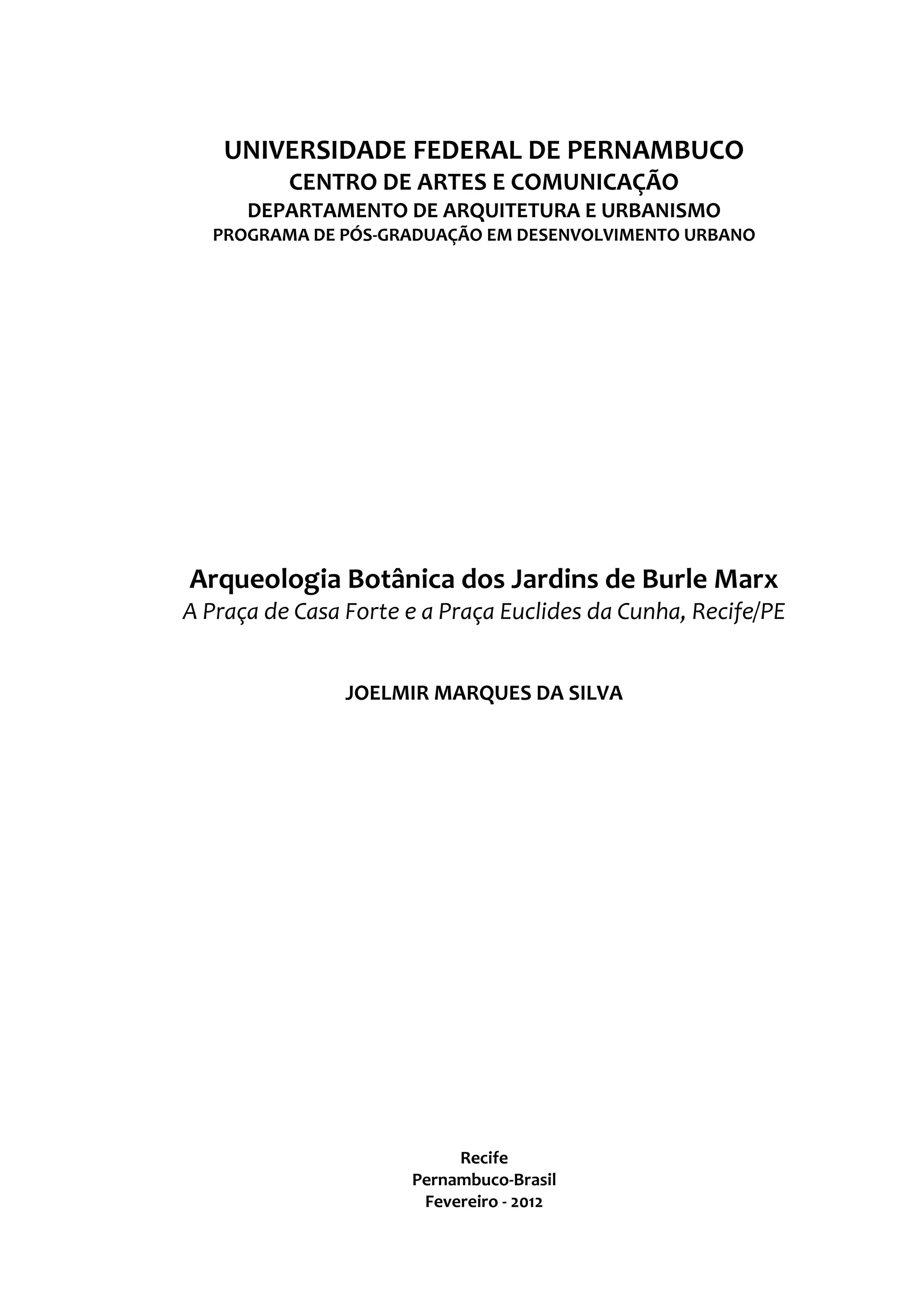 O documento apresenta um resumo da dissertação "Arqueologia Botânica dos Jardins de Burle Marx: A Praça de Casa Forte e a Praça Euclides da Cunha, Recife/PE", de autoria de Joelmir Marques da Silva. O texto descreve que Roberto Burle Marx projetou treze jardins públicos no Recife entre 1935-1937, sendo a Praça de Casa Forte e a Praça Euclides da Cunha os primeiros. O estudo teve como objetivo identificar a composição florística original e atual dessas praças para