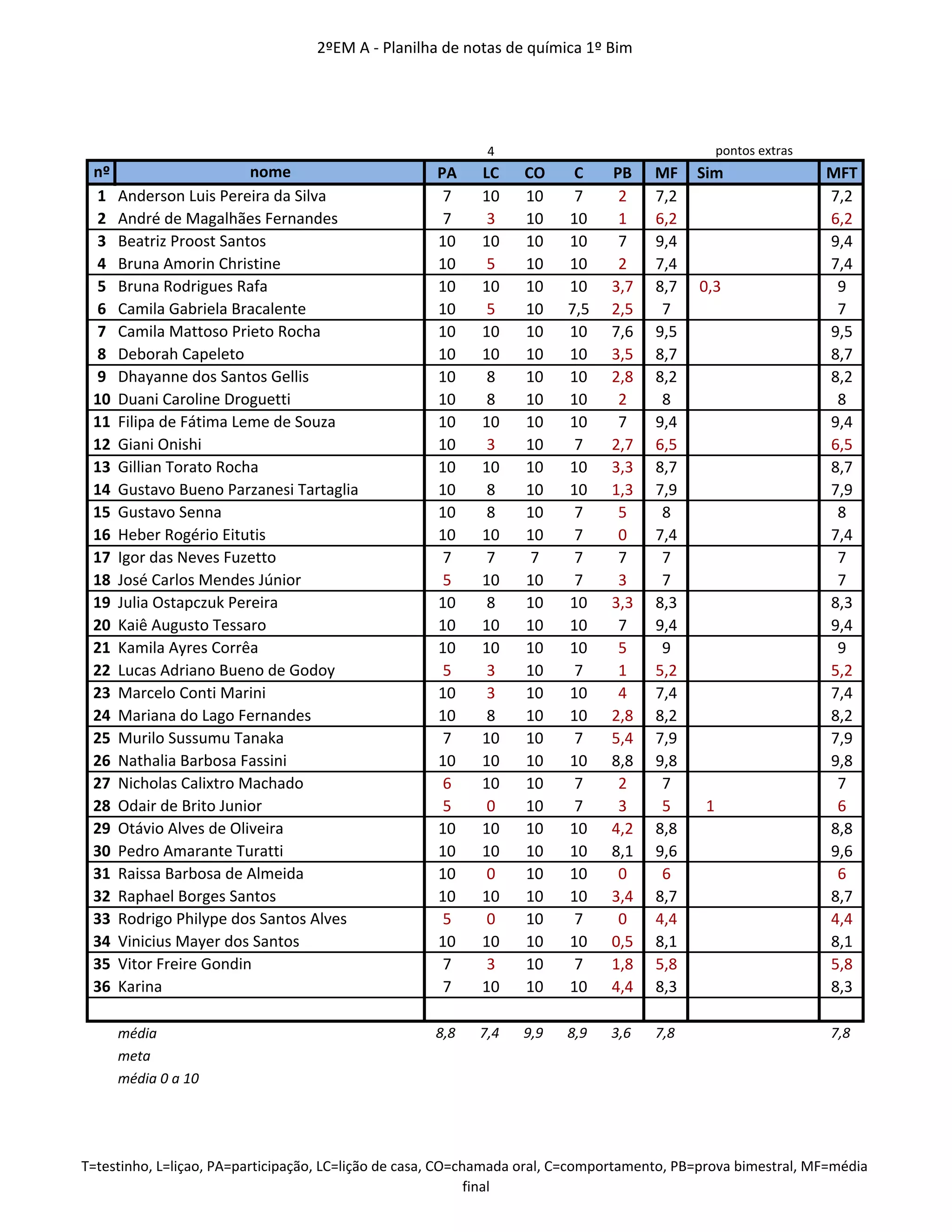 Este documento apresenta a planilha de notas do 1o bimestre de química da turma 2oEM A. Contém os nomes dos alunos, as notas obtidas em testes, lições, participação, lição de casa, chamada oral, comportamento e prova bimestral, além das médias da turma e a meta estabelecida.