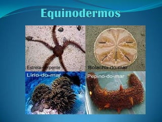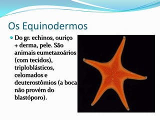 O documento descreve os principais aspectos dos equinodermos, incluindo sua classificação em cinco grupos (Asteroidea, Ophiuroidea, Echinoidea, Holothuroidea e Crinoidea), seus sistemas hidrovascular, nervoso e digestivo, alimentação, regeneração e reprodução.