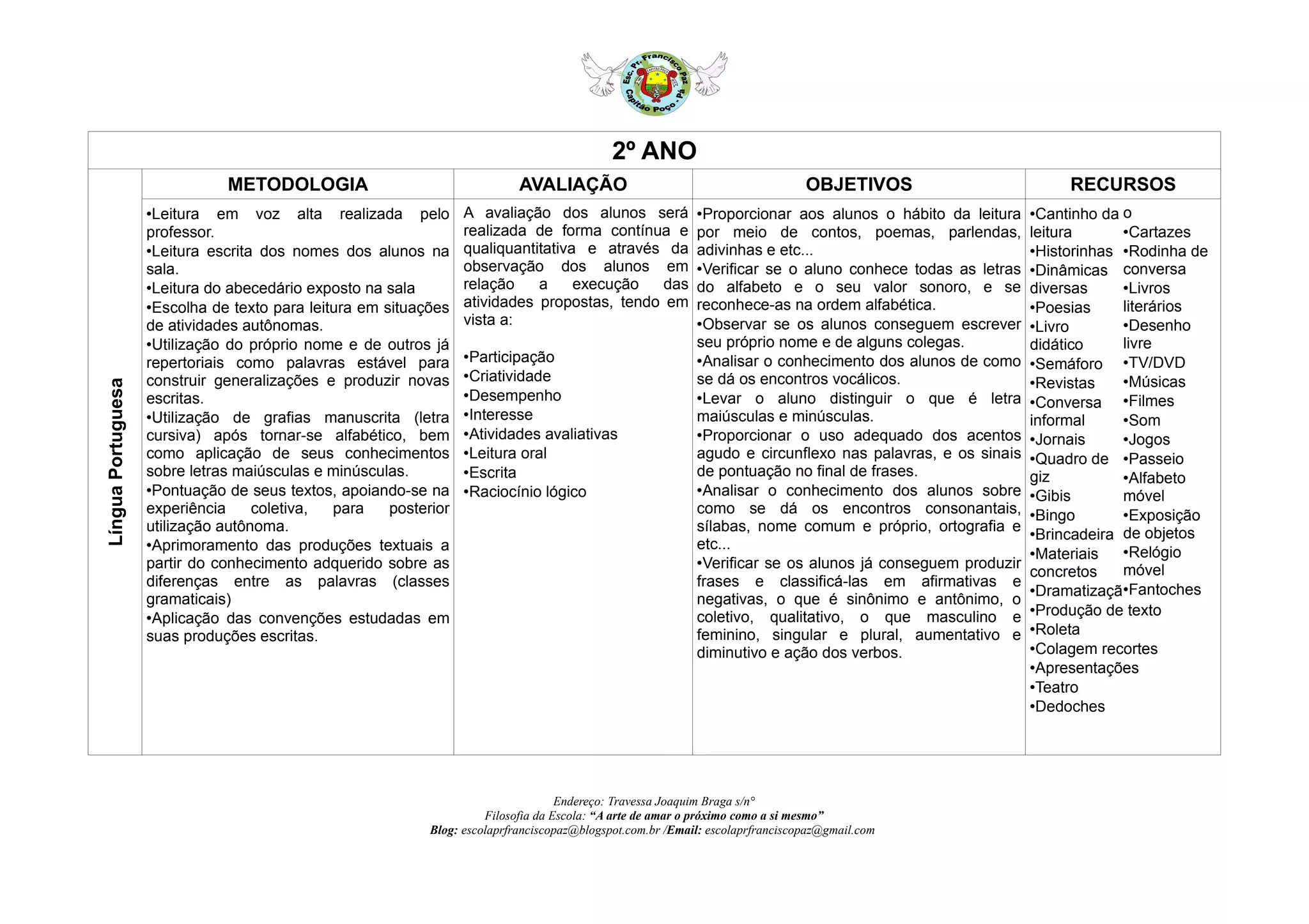 Este documento descreve o plano de aula para a disciplina de Português do 2o ano. Ele inclui a metodologia, avaliação, objetivos e recursos utilizados. O foco é no desenvolvimento da leitura, escrita e produção textual dos alunos.