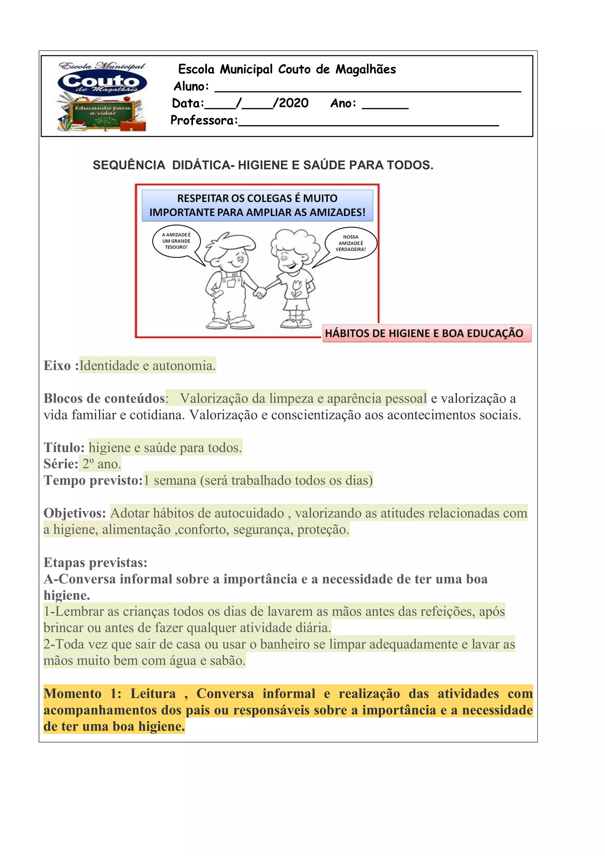 Este documento fornece uma sequência didática sobre higiene e saúde para alunos do 2o ano. Ele inclui objetivos de adotar hábitos de autocuidado valorizando a higiene, alimentação, conforto e segurança. As etapas incluem conversas sobre a importância da higiene e lembrar as crianças de lavarem as mãos antes de comer e depois de brincar.