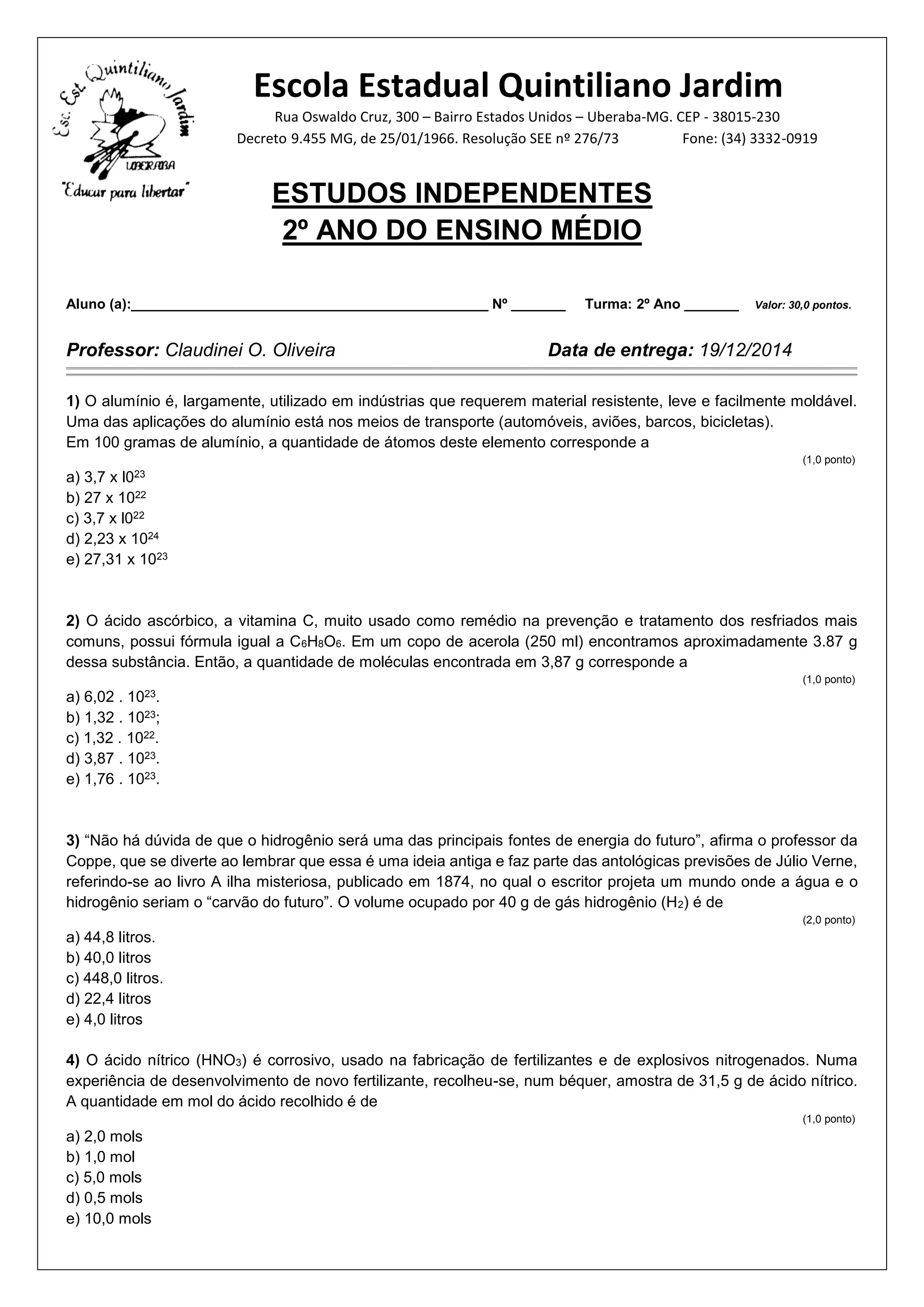O documento apresenta uma lista de exercícios sobre química envolvendo conceitos como concentração de soluções, números de oxidação, reações químicas e pH. Os exercícios abordam tópicos como propriedades do alumínio, vitamina C, hidrogênio, ácido nítrico, cloreto de sódio, oxalato de cálcio e bicarbonato de sódio.