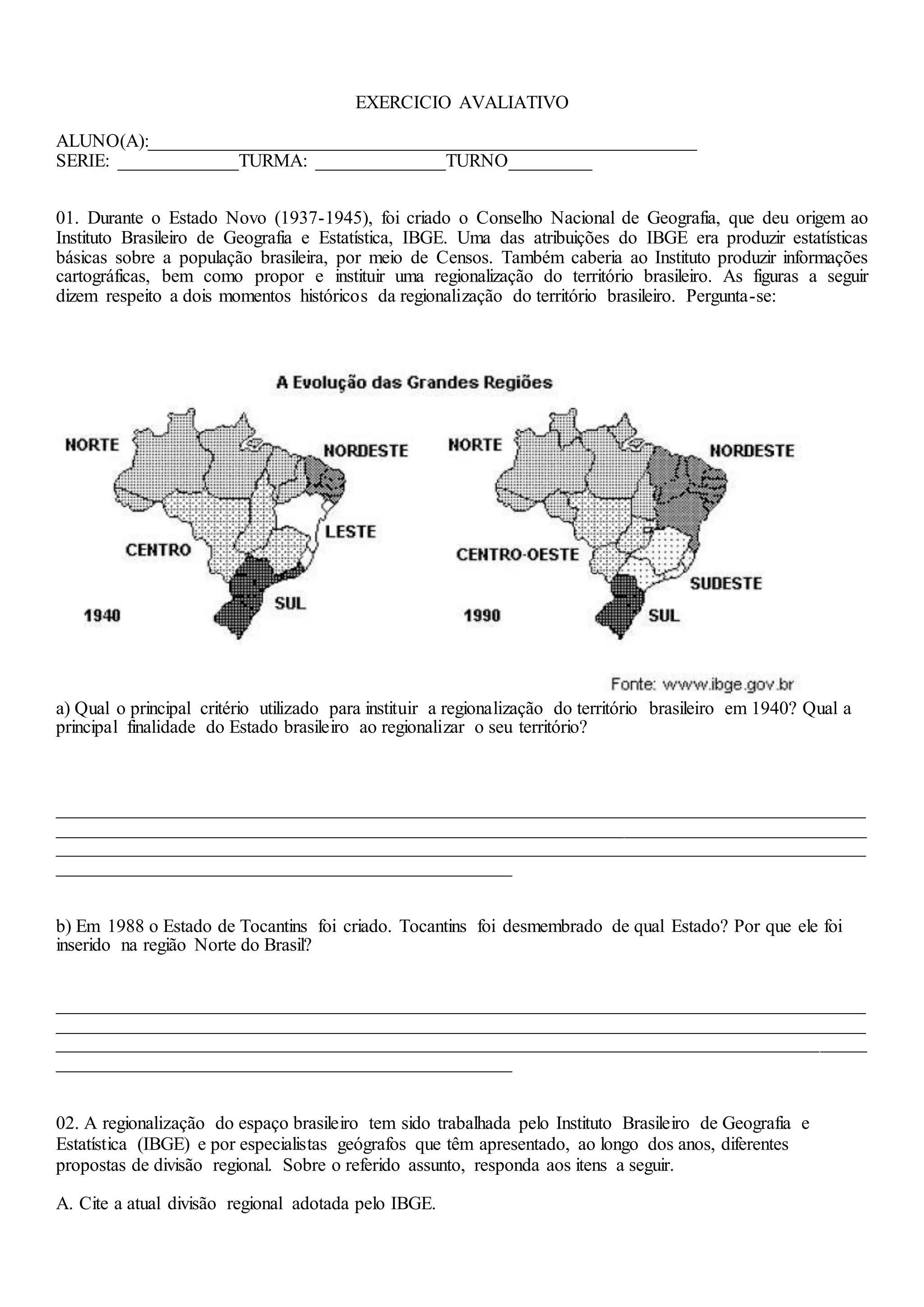 O documento discute a regionalização do território brasileiro ao longo da história. Ele descreve como o IBGE regionalizou o Brasil em 1940 com base em critérios geográficos e econômicos e como Tocantins foi criado em 1988 a partir do estado do Goiás e inserido na região Norte. O documento também lista as atuais divisões regionais do IBGE e de Pedro Pinchas Geiger com base em critérios diferentes.