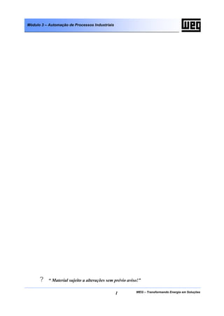 O documento descreve um módulo de treinamento sobre automação de processos industriais. O módulo introduz controladores lógicos programáveis, incluindo sua história, definição, princípios de funcionamento e aspectos de hardware e software. Também discute sistemas associados como redes de comunicação e supervisão e controle.