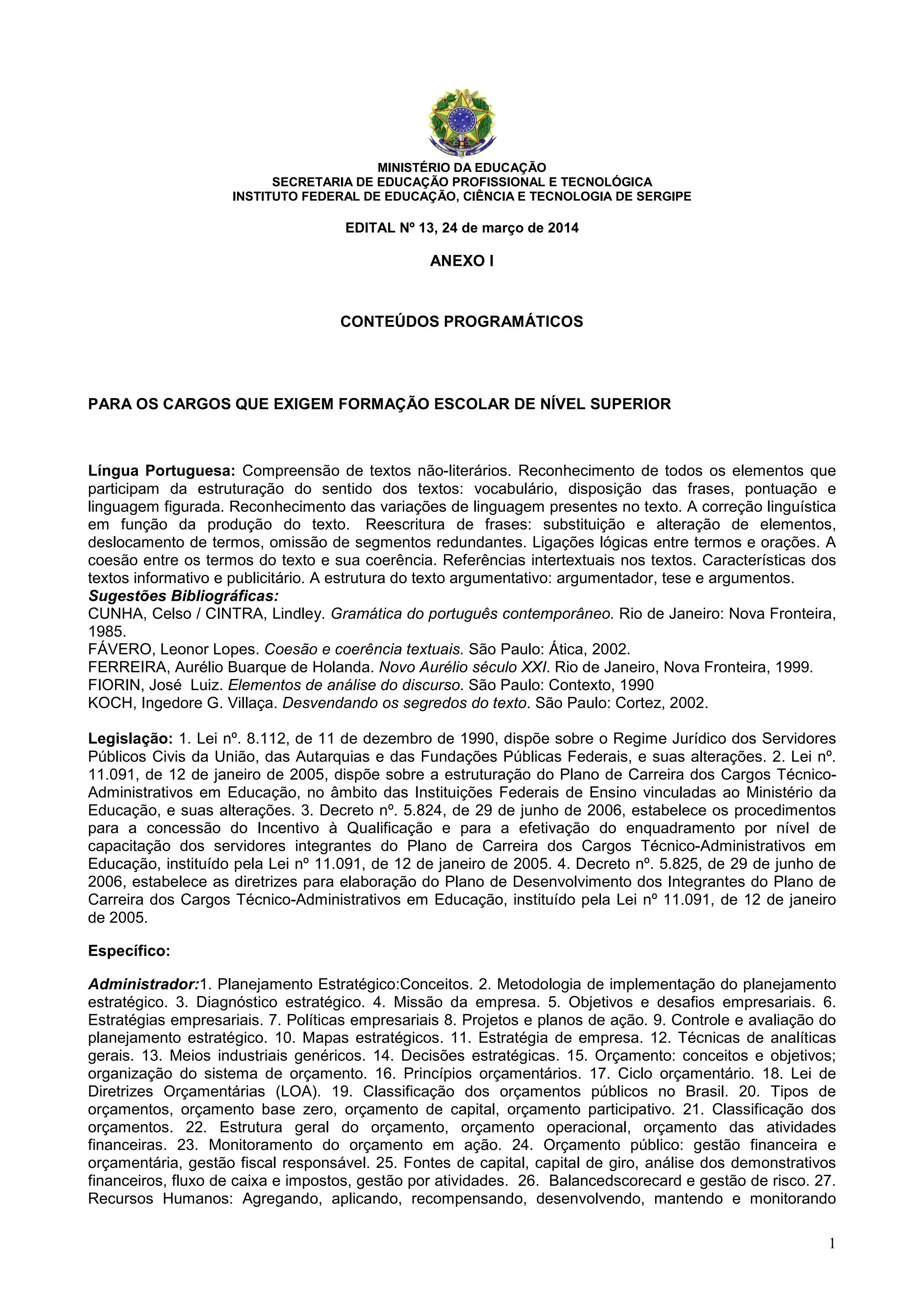 O documento apresenta conteúdos programáticos para cargos que exigem formação superior em diversas áreas, incluindo língua portuguesa, administração, arquivologia e serviço social. Fornece detalhes sobre os tópicos a serem cobrados em cada área, assim como sugestões bibliográficas para estudo. A legislação relacionada a cada cargo é também listada.