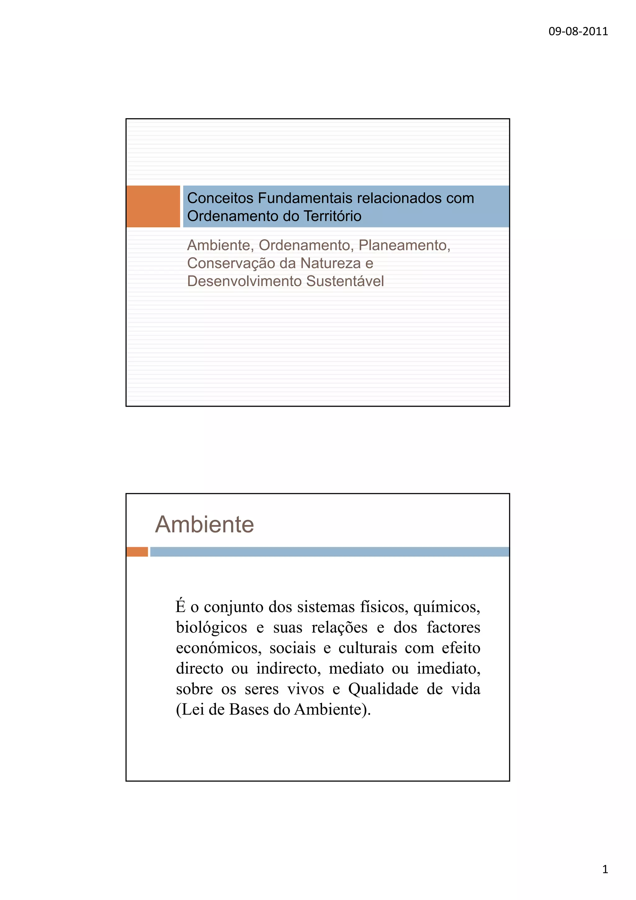 1) O documento discute conceitos fundamentais relacionados a ordenamento do território, ambiente, planejamento, conservação da natureza e desenvolvimento sustentável.