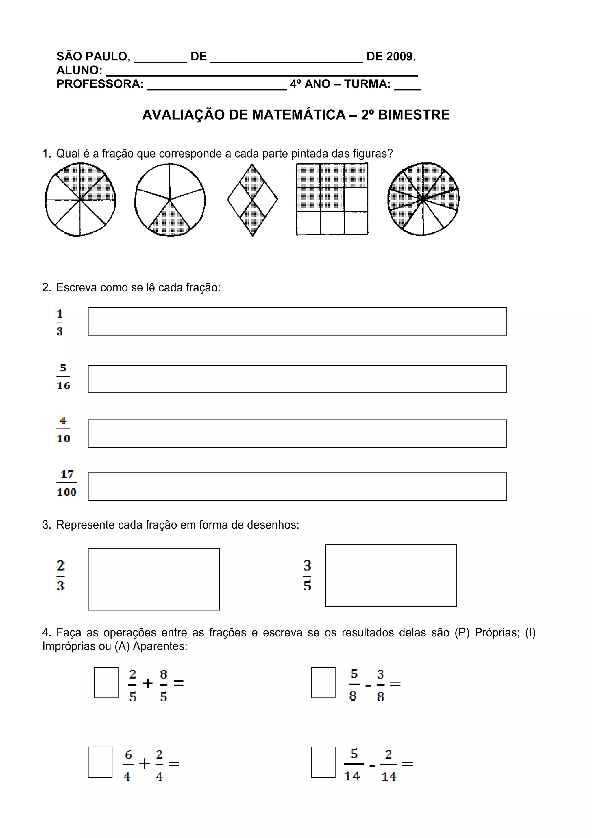 Este documento contém uma avaliação de matemática para alunos do 4o ano com 10 questões sobre frações, operações matemáticas, gráficos e mapas. As questões incluem representar frações em desenhos, calcular gastos em uma festa, interpretar um gráfico de programas de TV assistidos e localizar uma rua em um mapa após movimentações indicadas.