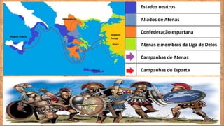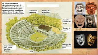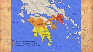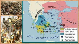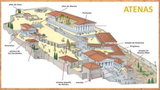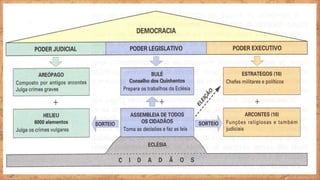 O documento descreve aspectos da civilização grega antiga, incluindo suas características, fases históricas e as cidades-estado de Esparta e Atenas. Resume que a Grécia antiga desenvolveu uma sociedade escravista com cidades-estado independentes, como Esparta, que tinha um governo militarista e oligárquico, e Atenas, que estabeleceu uma das primeiras democracias.