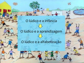 O documento discute a importância da ludicidade na aprendizagem, enfatizando que o brincar é essencial para o desenvolvimento cognitivo, social e afetivo das crianças. Ressalta que os jogos devem ser mediadores do aprendizado, complementados por estratégias didáticas e com um planejamento cuidadoso por parte dos educadores. Além disso, enfatiza que a ludicidade pode ser incorporada a diversas atividades curriculares, enriquecendo a experiência de aprendizado e a interação entre as crianças.