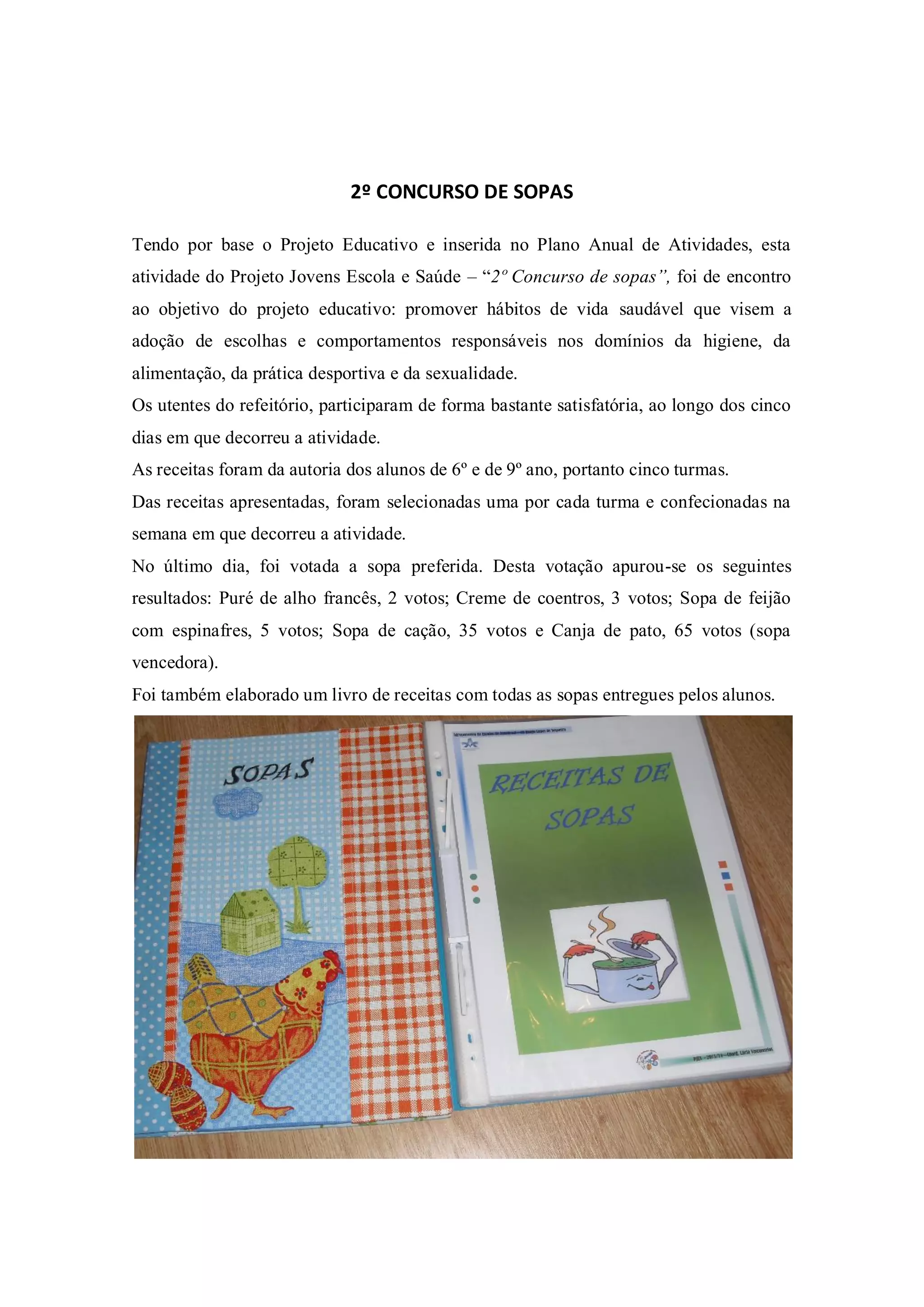 A escola realizou um concurso de sopas durante cinco dias no refeitório. Alunos do 6o e 9o ano enviaram receitas e uma de cada turma foi selecionada e preparada. No último dia, os alunos votaram na sopa preferida, onde a Canja de pato foi a vencedora com 65 votos.