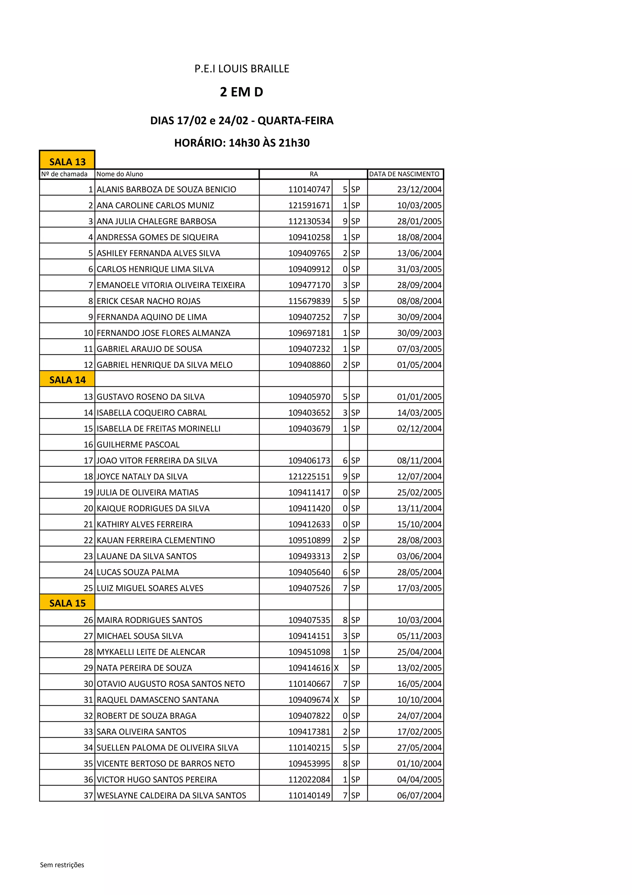 O documento lista 37 alunos matriculados em três salas de aula, fornecendo nome, número de matrícula, série e data de nascimento de cada um. As salas são identificadas como Sala 13, Sala 14 e Sala 15. A lista também inclui informações sobre o horário e datas de aulas extras para o curso de P.E.I Louis Braille realizadas às quartas-feiras das 14h30 às 21h30 nos dias 17 e 24 de fevereiro.