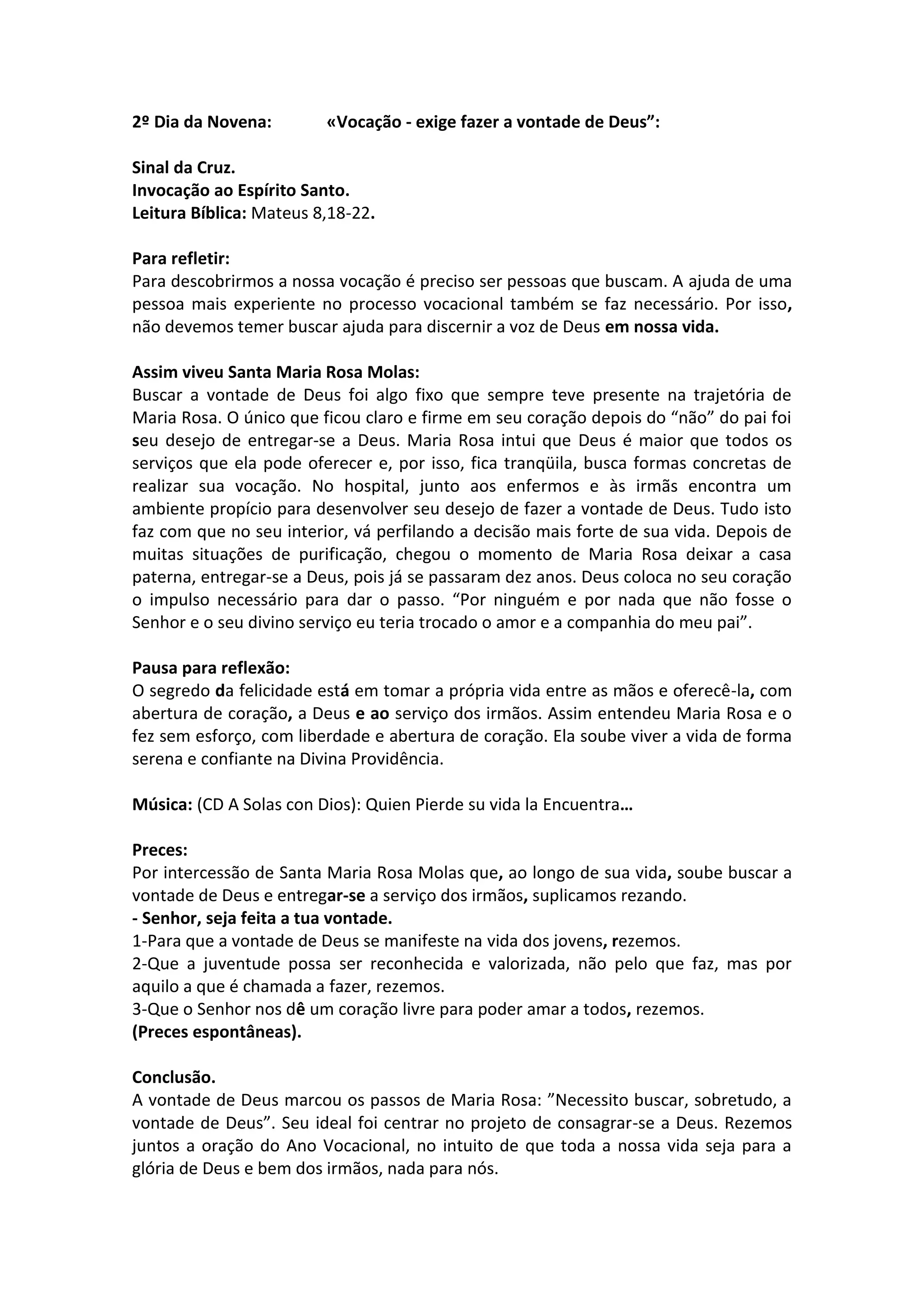 [1] O documento discute como Santa Maria Rosa Molas buscou descobrir e realizar a vontade de Deus em sua vida através da oração, da ajuda de outras pessoas e do serviço aos necessitados. [2] Ela sentiu o chamado para deixar sua casa e dedicar-se totalmente a Deus após anos de discernimento. [3] O texto incentiva os jovens a oferecerem suas vidas a Deus e ao serviço dos outros para encontrarem a felicidade.