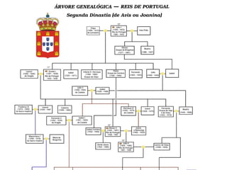 Este documento lista os reis da 2a Dinastia de Portugal, a Dinastia de Avis, incluindo seus nomes, cognomes, datas de nascimento e morte. A dinastia reinou de 1385 a 1581, tendo começado quando D. João de Avis foi aclamado rei após a crise de 1383-1385. O rei mais importante foi D. João I e a construção mais notável foi o Mosteiro da Batalha.