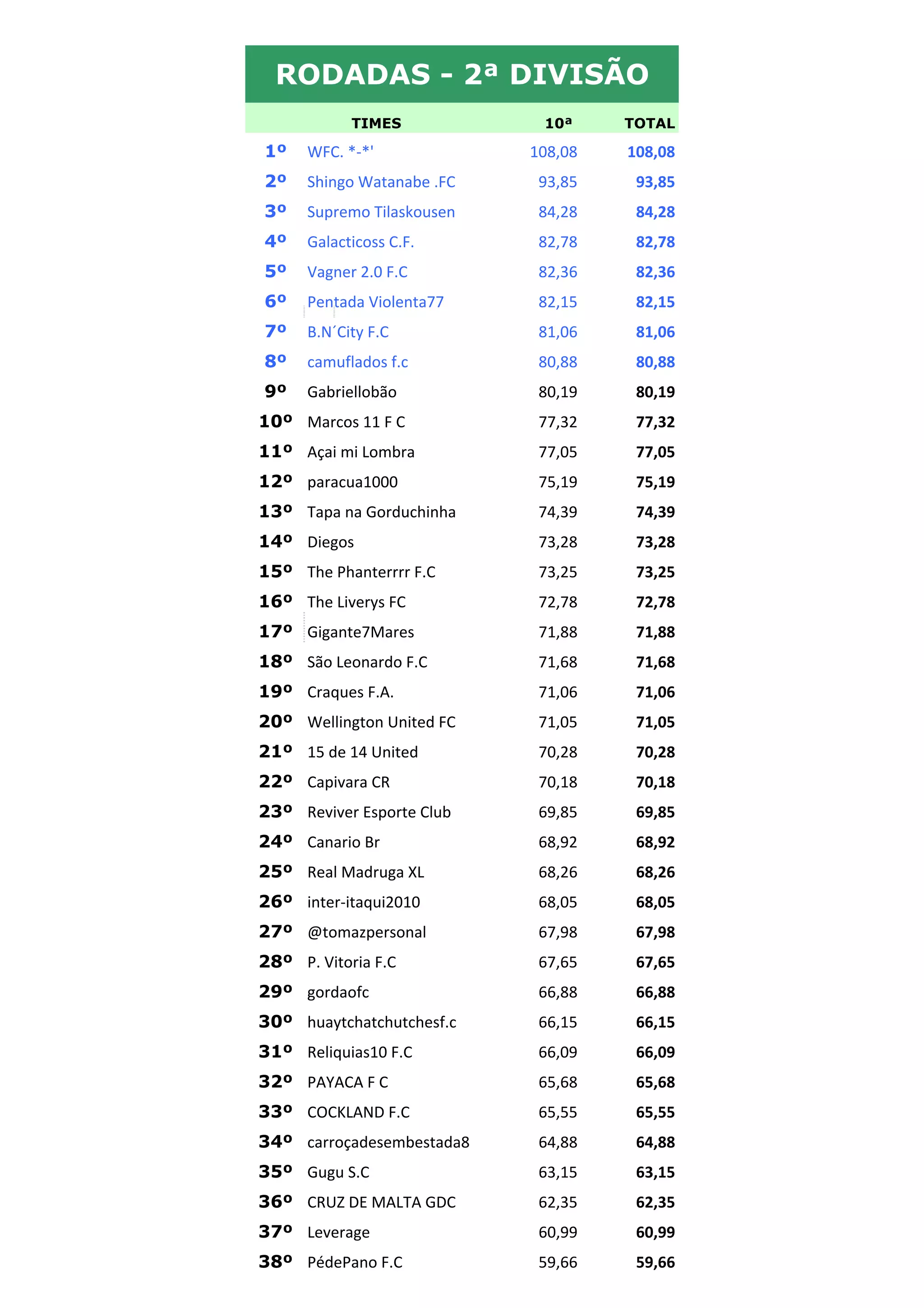 Este documento apresenta a classificação de 103 times participantes da 2a divisão de alguma liga/campeonato. O time WFC está em 1o lugar com 108,08 pontos no total. O time em último, r@yhure f.c, tem 27,89 pontos no total.