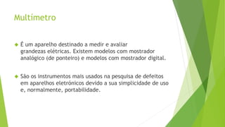 O documento discute vários equipamentos usados para diagnosticar e consertar problemas em equipamentos eletrônicos, incluindo multímetros analógicos e digitais, osciloscópios e sondas lógicas. Multímetros medem grandezas elétricas e são amplamente usados para identificar defeitos, enquanto osciloscópios mostram sinais elétricos ao longo do tempo e sondas lógicas determinam os níveis lógicos em circuitos digitais.