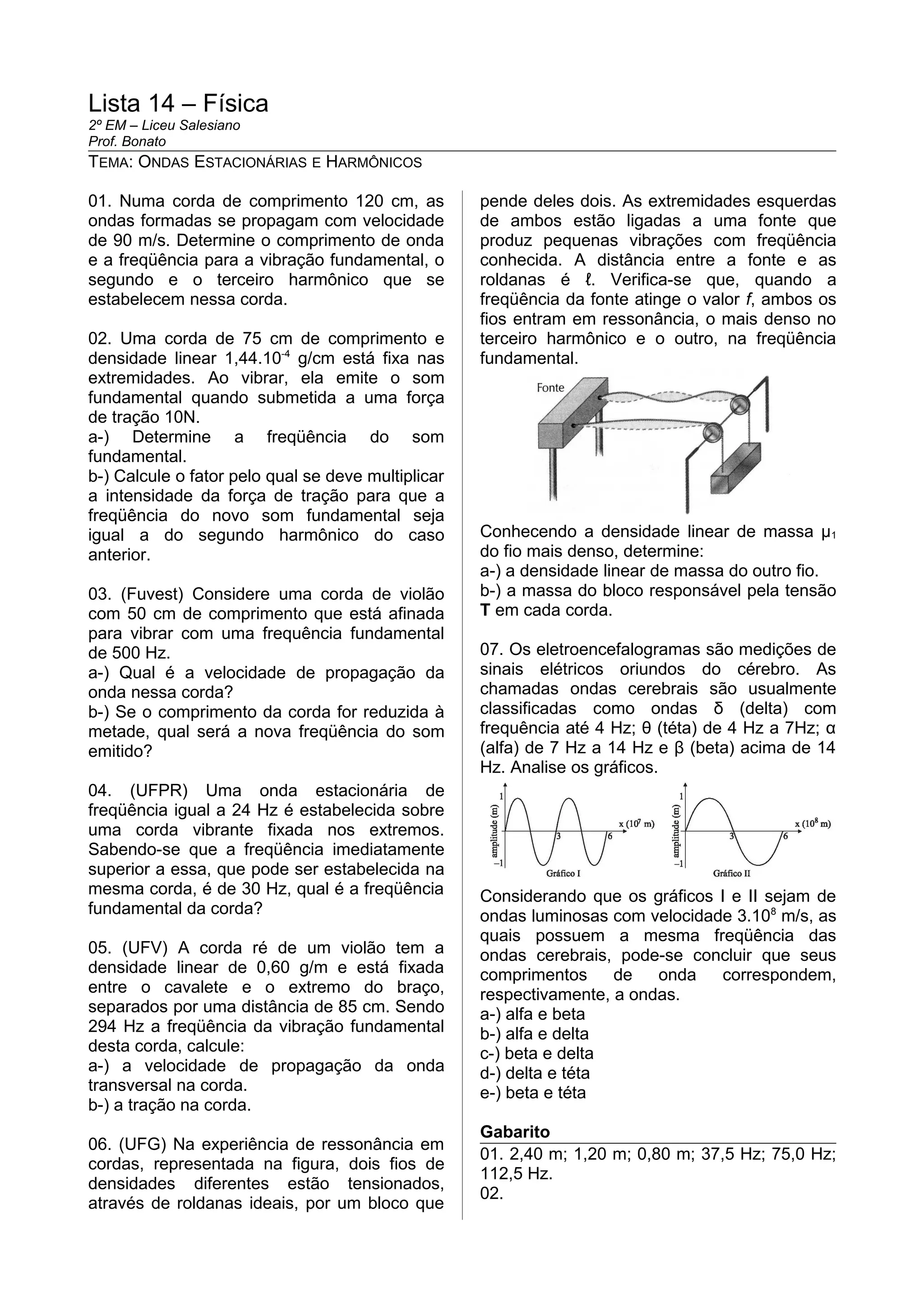 1) O documento apresenta 7 questões sobre ondas estacionárias e harmônicos em cordas vibrantes. As questões abordam tópicos como comprimento de onda, frequência, velocidade de propagação e tração em cordas.