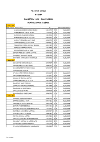Este documento lista os alunos matriculados em três salas de aula, identificados por número de chamada, nome, data de nascimento. Contém informações sobre 35 alunos em cada sala, totalizando 105 alunos distribuídos em três salas de aula.