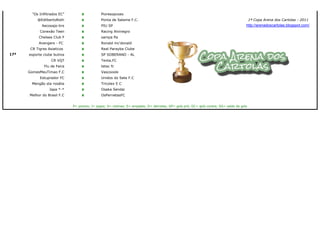 Este documento apresenta a tabela de classificação e os jogos da 2a fase de uma competição entre times de futebol. A tabela mostra os nomes dos times participantes, seus resultados e suas posições na classificação geral após a conclusão da primeira rodada de jogos da 2a fase.