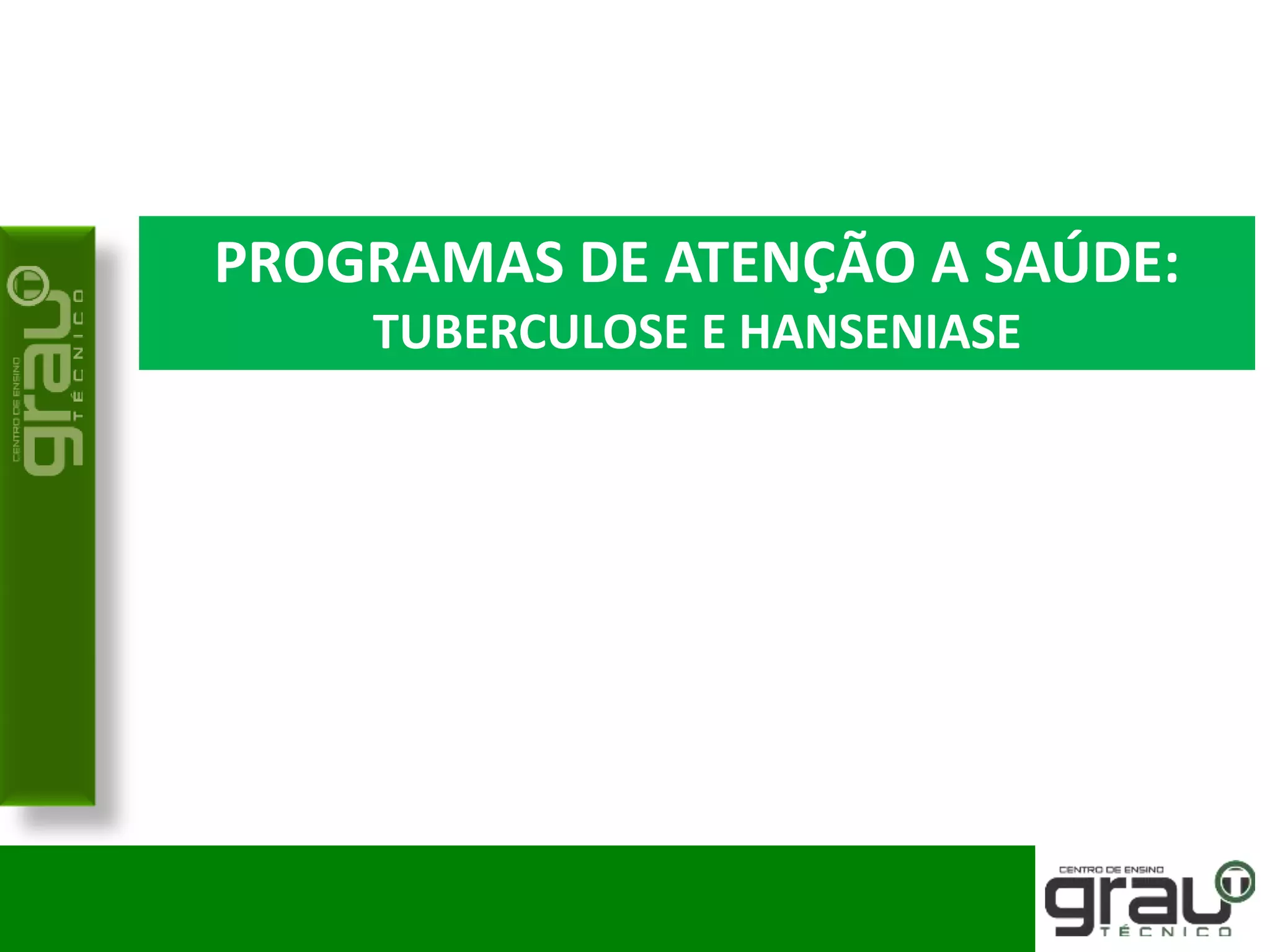 O documento discute programas de saúde para tuberculose e hanseníase. Ele fornece detalhes sobre causas, sintomas, diagnóstico e tratamento da tuberculose, além de descrever o Programa Nacional de Controle da Tuberculose. Também aborda a etiologia, transmissão e manifestações clínicas da hanseníase no âmbito do Programa de Controle da Hanseníase.