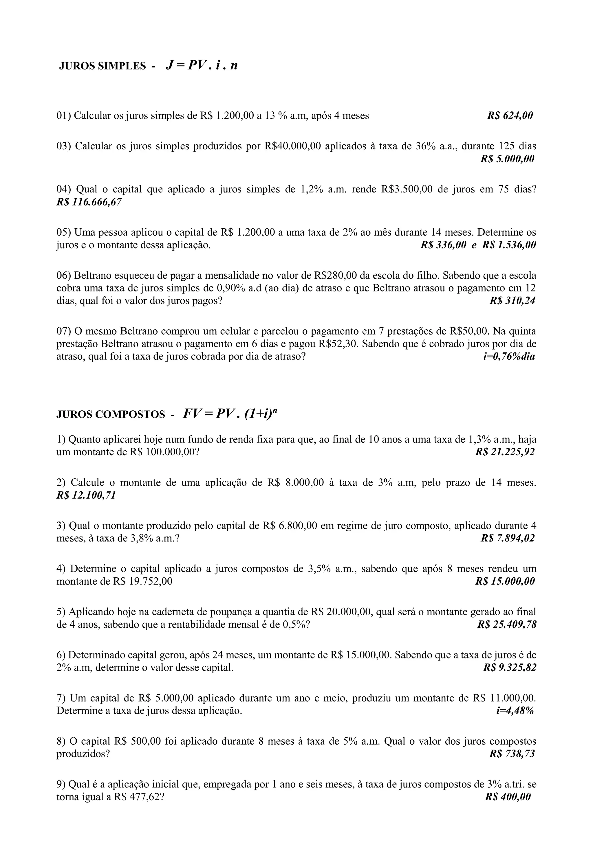 O documento apresenta exemplos de cálculos de juros simples e compostos, incluindo determinar juros, capital, taxa de juros e montante em diferentes situações como aplicações financeiras e atrasos de pagamento usando as fórmulas J = PV.i.n para juros simples e FV = PV.(1+i)n para juros compostos.