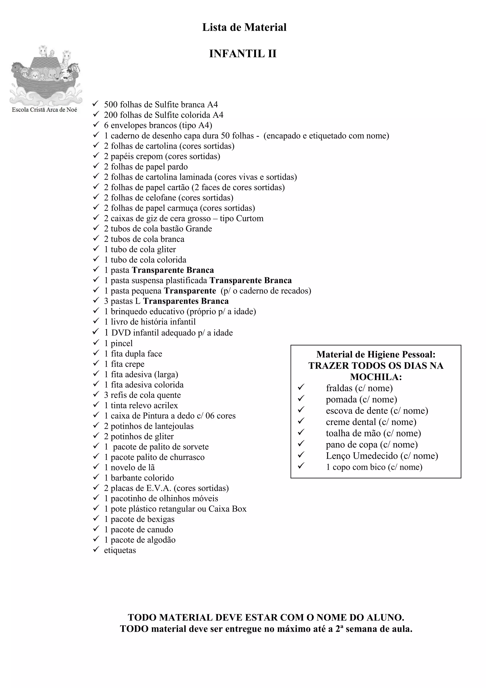 A lista contém itens de higiene pessoal e materiais escolares que as crianças devem trazer diariamente ou entregar na escola. Inclui fraldas, pomada, escova de dente e outros itens de higiene, além de papel, cadernos, lápis de cor, tintas, colas, tesouras e outros materiais para atividades manuais.