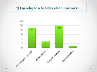 O documento apresenta os resultados de questionários respondidos por estudantes sobre o uso de bebidas alcóolicas e drogas. A maioria iniciou o consumo de bebidas alcoólicas influenciada por amigos e tem uma imagem positiva dessas bebidas, enquanto a maioria não usa drogas ou só experimentou uma vez. Sobre o uso de drogas, a maioria acredita que representam perigo para a saúde.