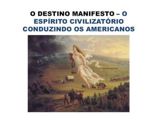 Após a independência, os Estados Unidos expandiram seus territórios através da compra, conquista e diplomacia para obter mais terras para agricultura e acomodar imigrantes. Isso resultou na anexação de 23 novos estados entre 1820 e 1860 e aumento populacional de mais de 20 milhões de pessoas, apesar dos impactos negativos sobre os povos indígenas e o meio ambiente. No entanto, divergências sobre a expansão da escravidão levaram à Guerra Civil entre o Norte abolicionista e o Sul pró-