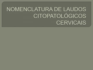 O documento descreve a classificação de citologia cervical em 5 classes e discute as alterações celulares que podem ser identificadas nos exames de Papanicolau, incluindo lesões pré-malignas e malignas. A classificação foi atualizada para melhor diferenciar lesões escamosas e glandulares e incluir diagnósticos sugestivos de infecção por HPV.