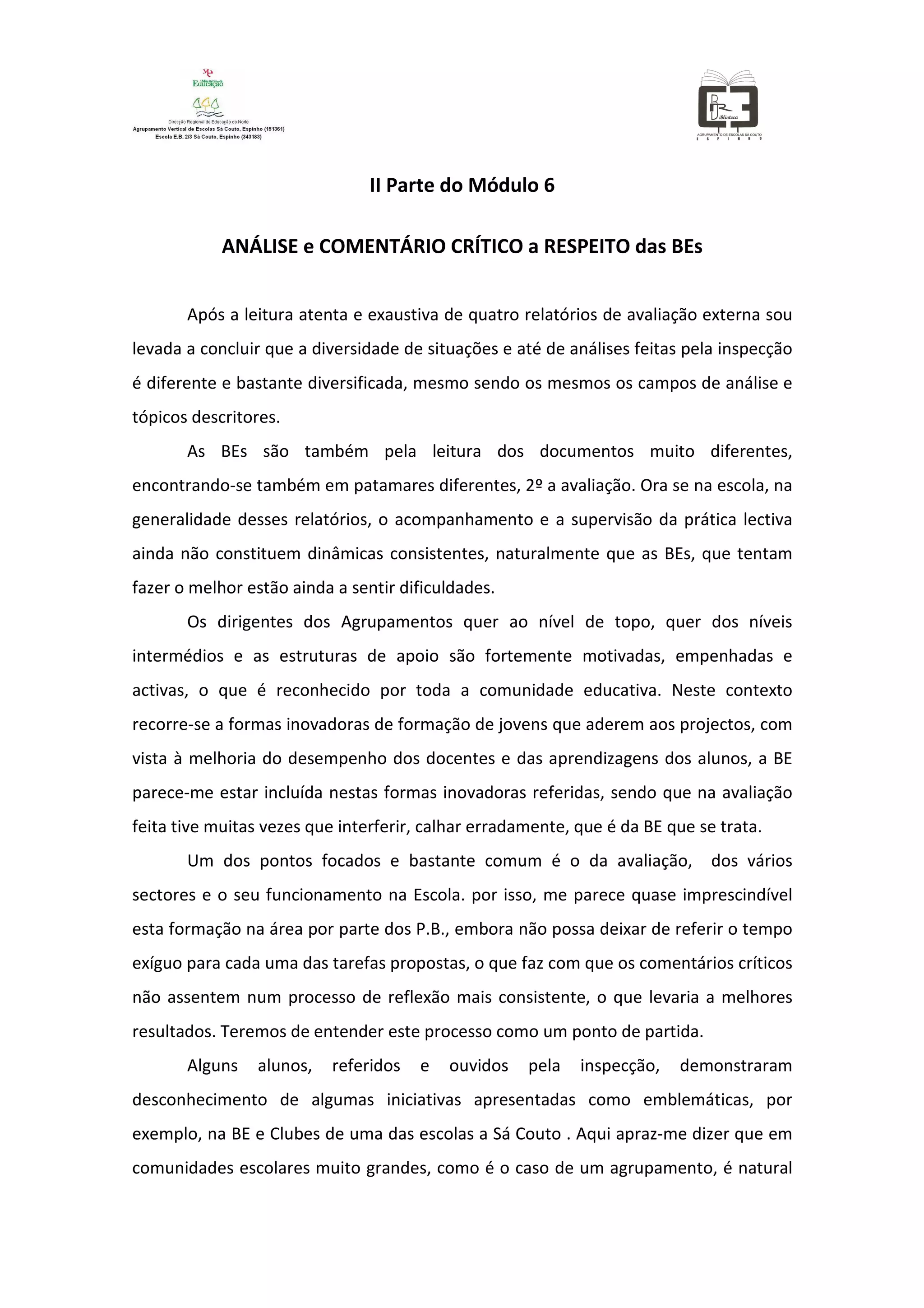 1) A autora analisou quatro relatórios de avaliação externa e concluiu que as avaliações das BEs foram tratadas de forma diferente e superficial.