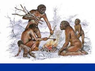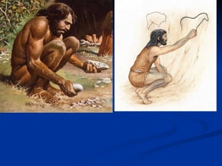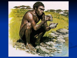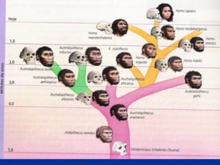 O documento resume a pré-história, desde os primeiros hominídeos há 7 milhões de anos até o povoamento da América. Aborda a evolução humana, com espécies como Homo habilis, Homo erectus e Homo sapiens, além dos principais períodos da pré-história como o Paleolítico, Mesolítico e Neolítico. Também discute a origem dos primeiros humanos no Brasil.