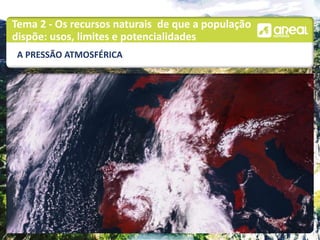 A pressão atmosférica é a força exercida pela atmosfera sobre a superfície da Terra e varia com a altitude, humidade e temperatura do ar. A circulação geral da atmosfera é caracterizada por células polares, células das latitudes médias e células equatoriais, que influenciam os ventos alísios, de oeste e de este.