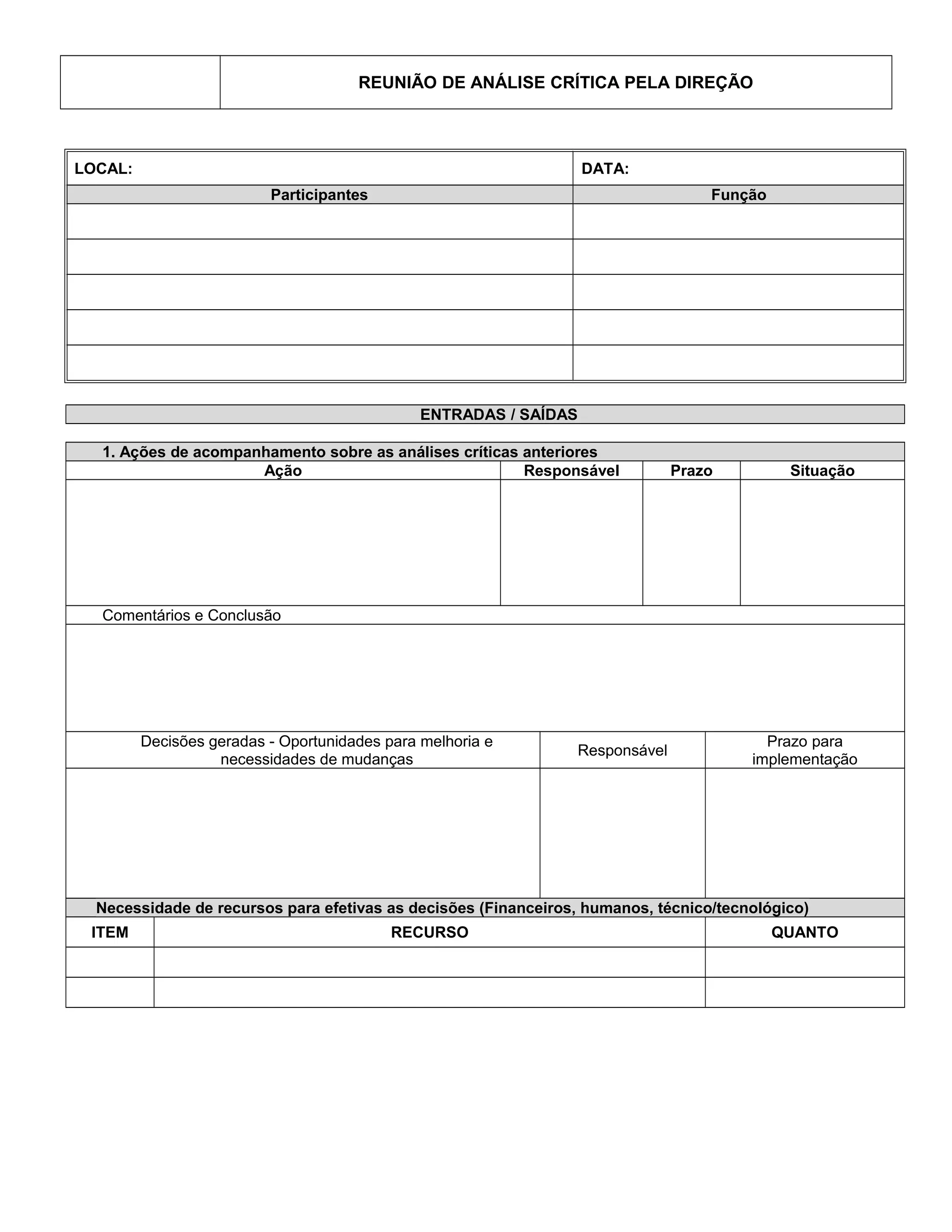 A reunião analisou os resultados de auditorias internas e externas, a satisfação e reclamações de clientes, o desempenho de processos e conformidade do produto, a situação de ações corretivas e preventivas, mudanças que podem afetar o sistema de gestão da qualidade, a política da qualidade, e objetivos, indicadores e metas. Várias decisões foram tomadas para melhorias, com responsáveis e prazos designados.